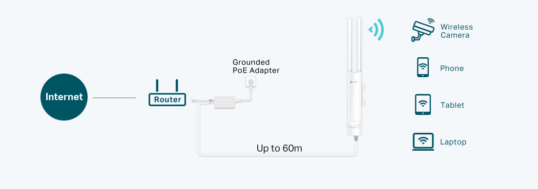 Pour les petits bureaux et les bureaux à domicile, un point d'accès extérieur est généralement déployé pour connecter les caméras sans fil, les téléphones, les tablettes et les ordinateurs portables. Avec l'adaptateur PoE passif inclus, connectez le point d'accès Omada à votre routeur existant, pour fournir des données et de l'alimentation simultanément à l'aide d'un seul câble Ethernet.