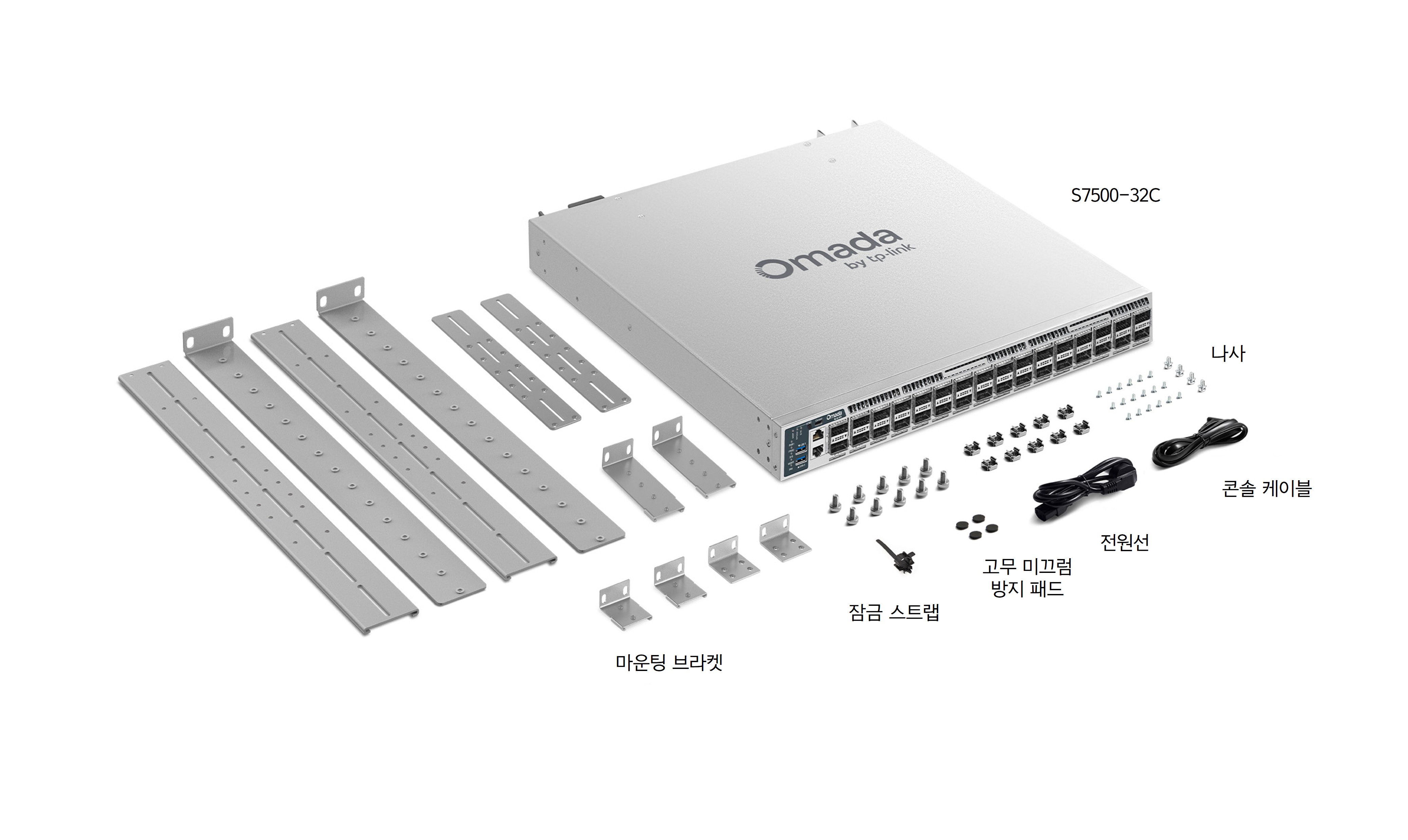 | 구성품 | • S7500-32C 스위치 • 전원 코드 • RJ45 콘솔 케이블 • 잠금 스트랩 • 랙마운트 키트 • 고무 미끄럼 방지 패드 • 빠른 설치 가이드 |