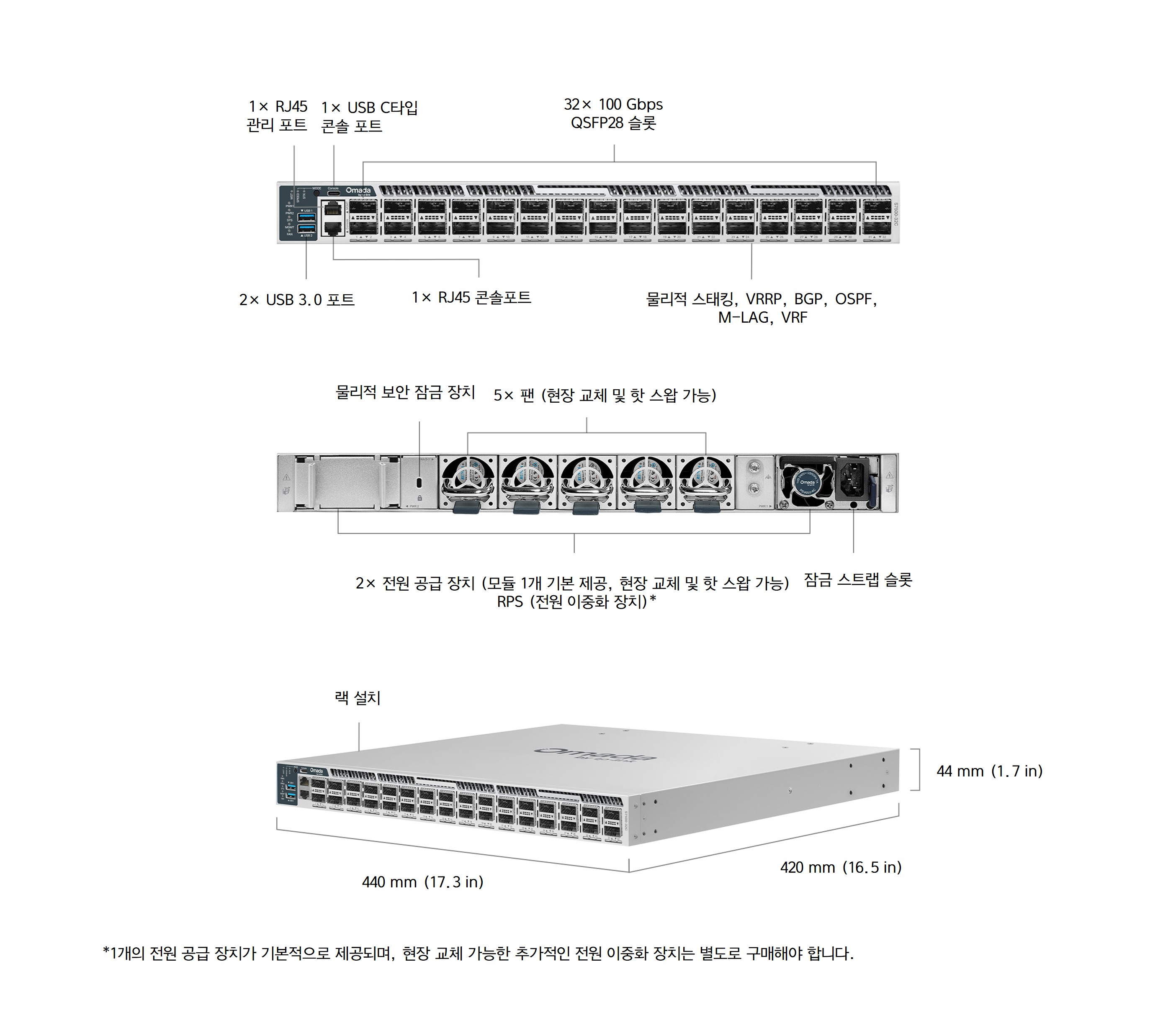 | 인터페이스 및 주요 사양 | • 32× 40/100G QSFP28 슬롯 • 2× USB 3.0 포트 • 1× RJ45 콘솔 포트 • 1× USB C타입 콘솔 포트 • 1× RJ45 관리 포트 |