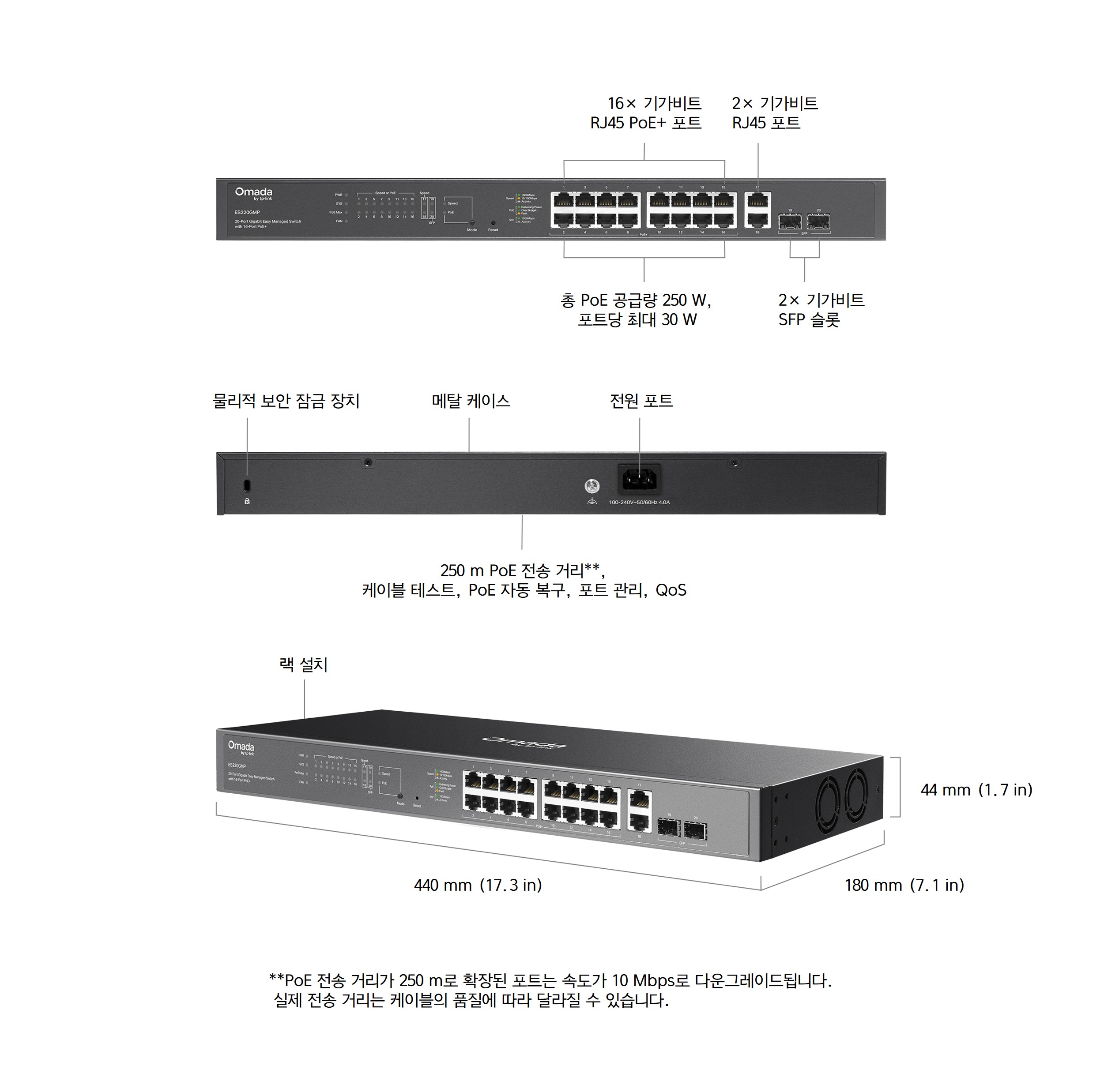 최대 250 m PoE 전송**