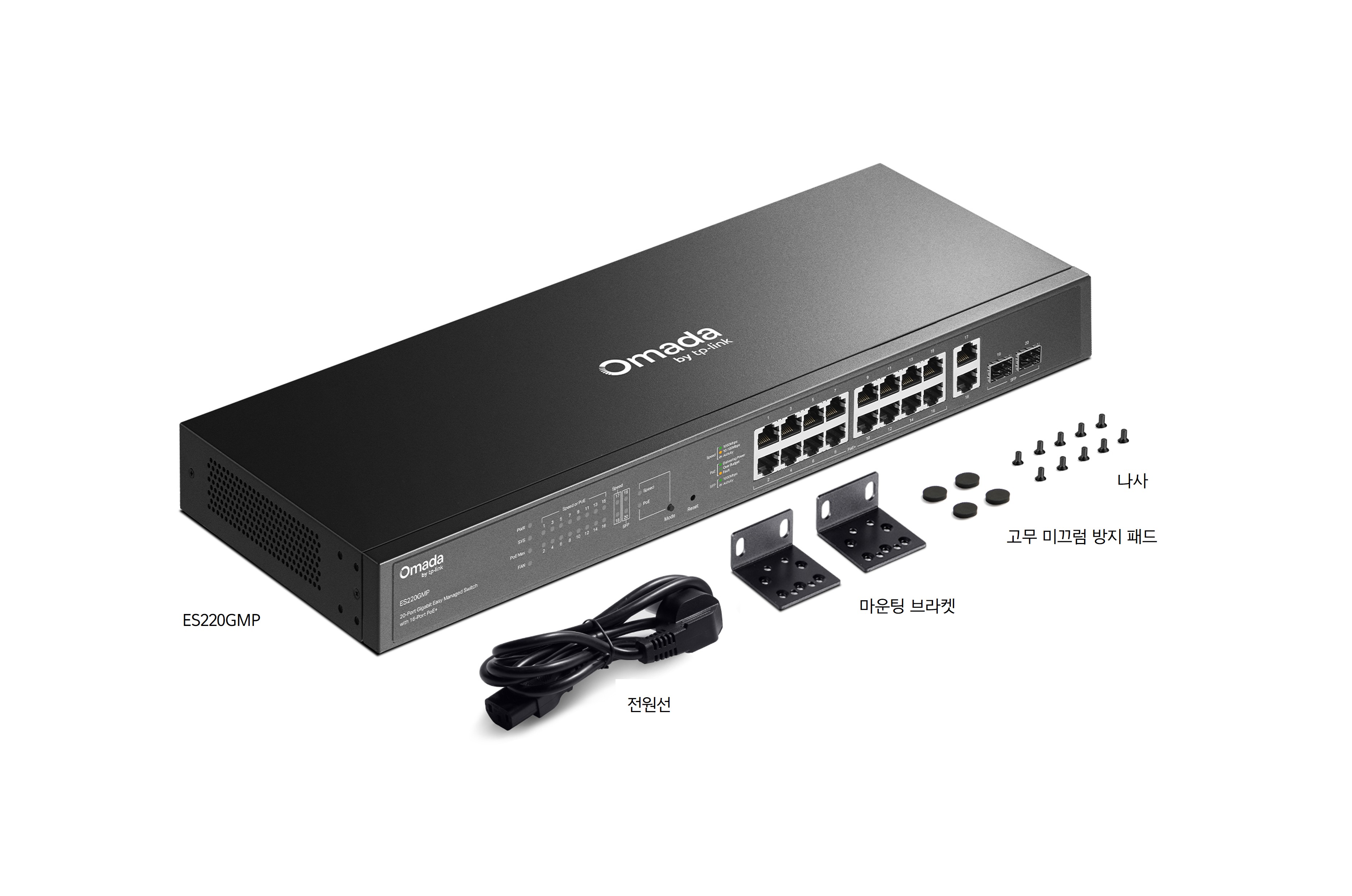 | 구성품 | • ES220GMP • 전원선 • 마운팅 브라켓 • 고무 미끄럼 방지 패드 • 나사 • 설치 가이드 |
