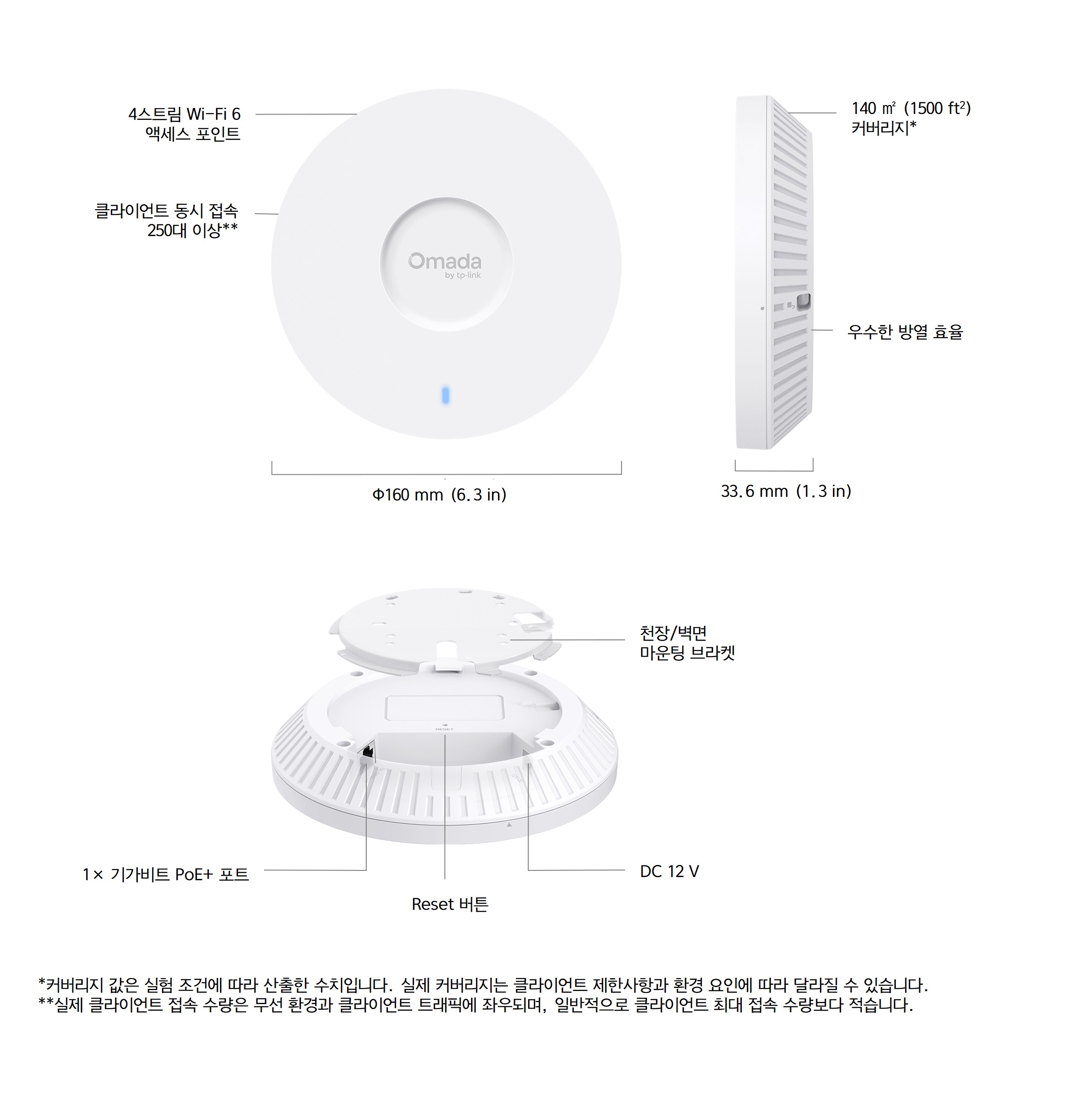 **실제 클라이언트 접속 수량은 무선 환경과 클라이언트 트래픽에 따라 다르며, 일반적으로 최대 클라이언트 접속 수량보다 적습니다.