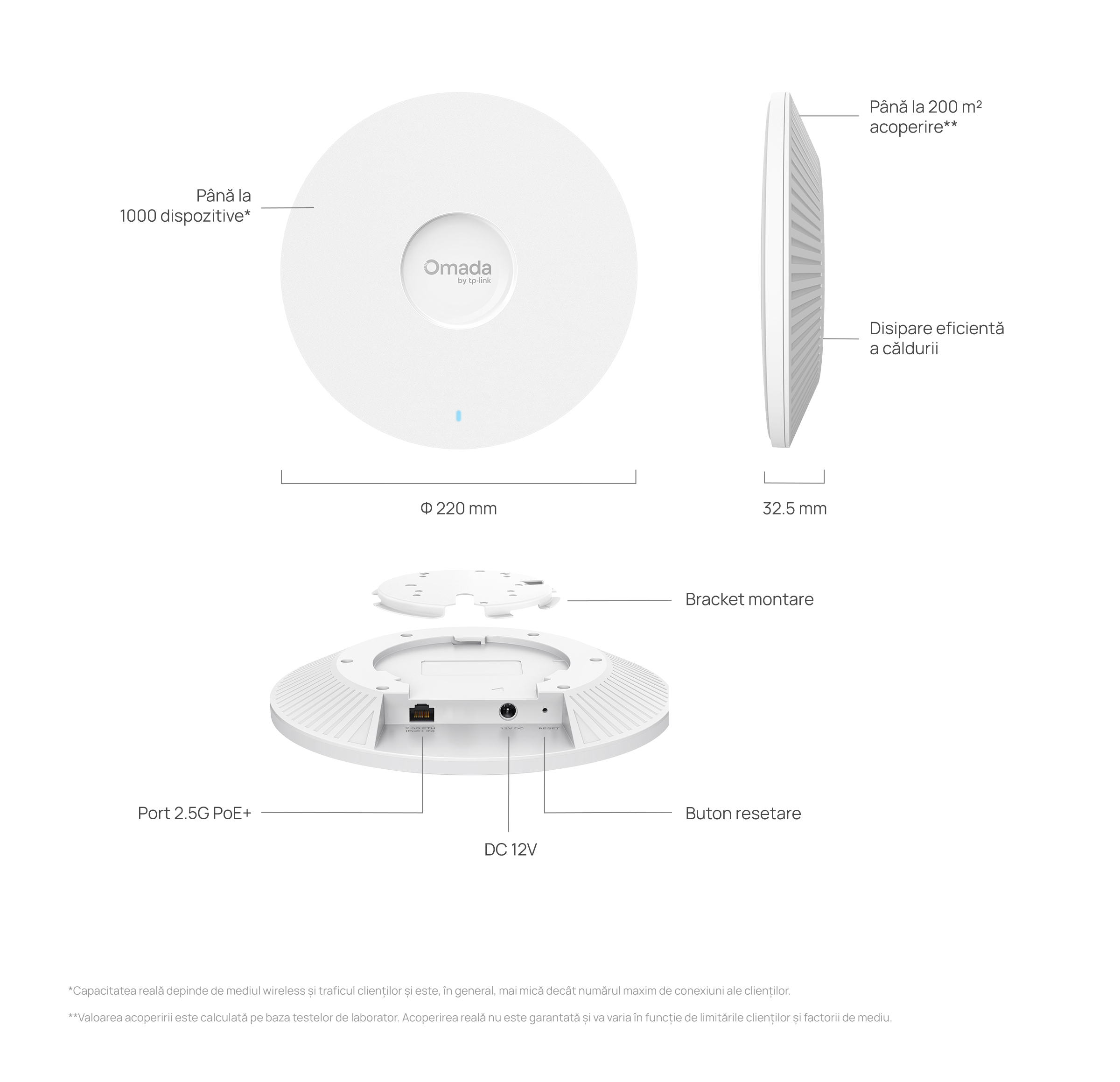 **Capacitatea reală depinde de mediul wireless și traficul clienților și este, în general, mai mică decât numărul maxim de conexiuni ale clienților.
