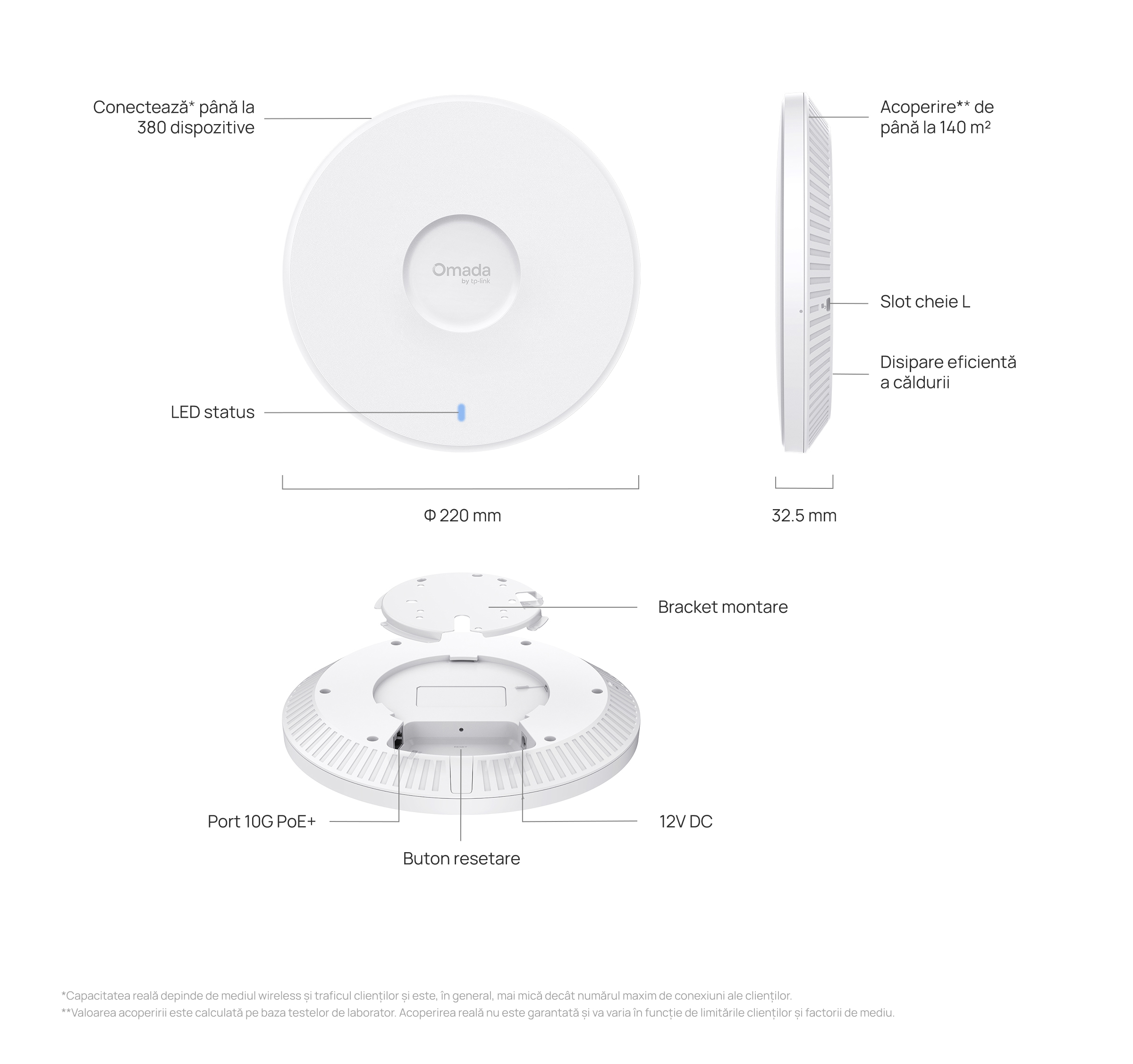 **Capacitatea reală depinde de mediul wireless și traficul clienților și este, în general, mai mică decât numărul maxim de conexiuni ale clienților.