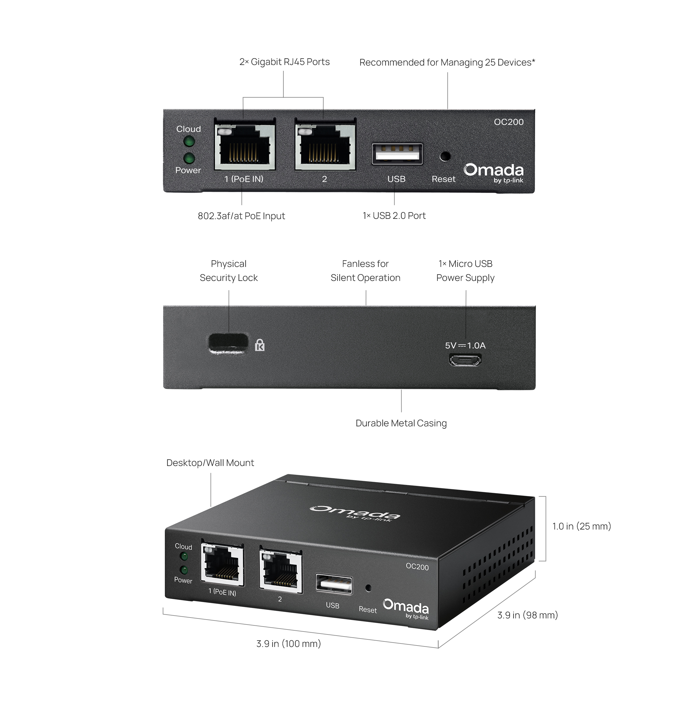 | Centralized Management | Recommended for managing 25 Omada devices*Please refer to www.tp-link.com/en/business-networking/all-omada/ to find all the Omada device models supported by OC200 |