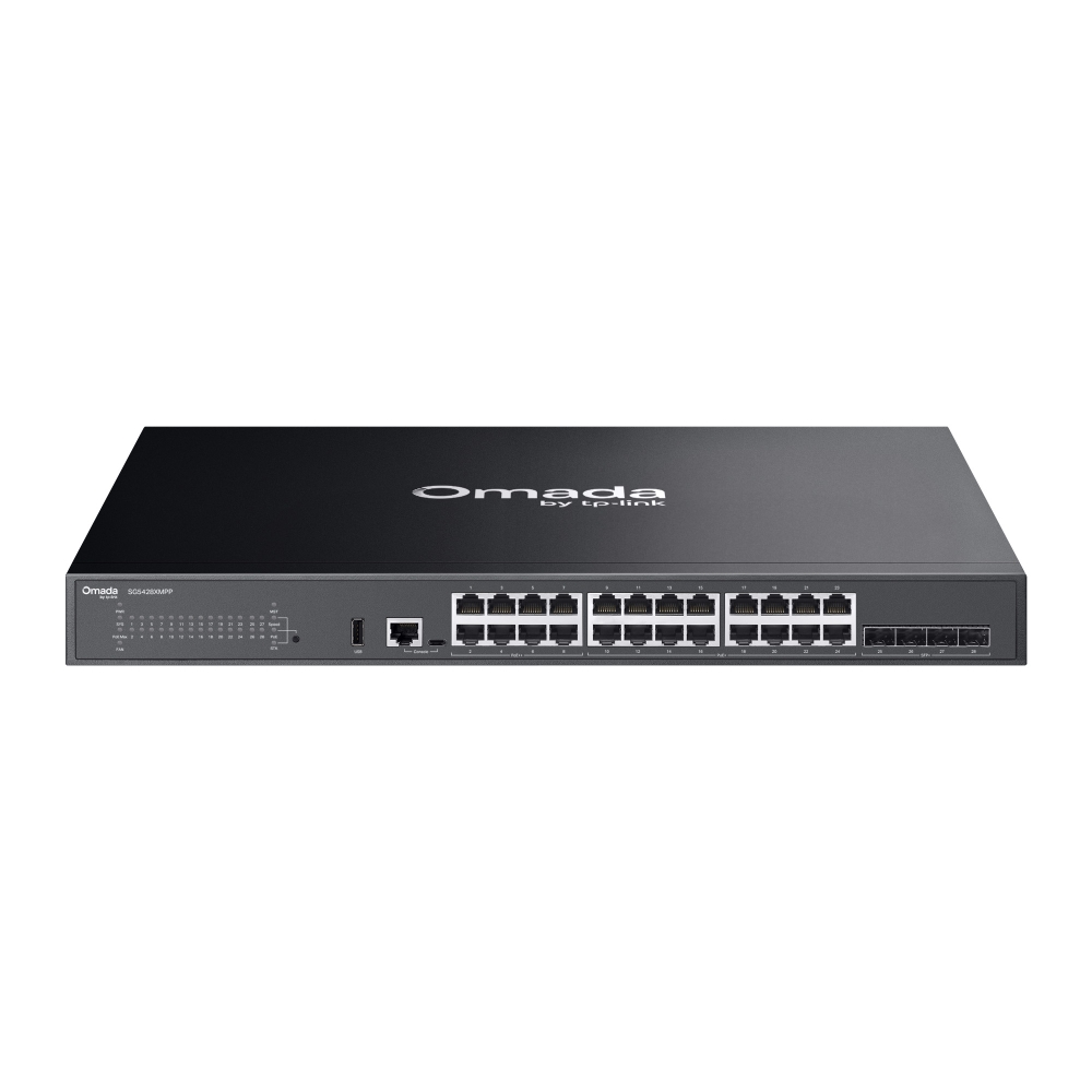 Omada SG5428XMPP is a dependable entry-level L3 managed PoE++ switch tailored for the access layer, featuring L3 routing, fast 10 Gbps uplink wired speeds, and stacking options. It boasts a 500W PoE budget,* 24× gigabit RJ45 ports (8× PoE++, 16× PoE+), 4× 10 Gbps SFP+ slots, physical stacking ability, and centralized management. Integrated with strong security and extensive management features, the SG5428XMPP offers a reliable networking solution for SMEs, and ISPs.